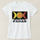 Al frente: Sobre un fondo negro, tres fases de la luna, un ouroboros y un triquetra, con ORGULLO DE SER PAGAN debajo.