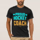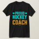 Camiseta del entrenador de hockey con texto azul acuático y oro dice Orgulloso entrenador de hockey.