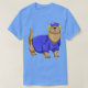 El color es muy bonito al natural, como la foto. El tejido es suave y de buena calidad. Sin defectos en el tintado, ni hilos sueltos o descosidos. Bien la impresión. Los bordes de las letras y el dibujo son nítidos, y el color contrasta muy bien con el de la camiseta.