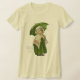 Joven chica irlandesa sosteniendo un paraguas verde y vistiendo una gorra y chal sobre su larga falda verde sobre la capa de guarnecido dorado de vieiras blancas y fondo verde pastel. Este diseño vintage ha sido restaurado a mano. Vintage dice Gra Galmachree Ould Ireland, ¡tu darlin!