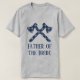 Muestra a tu padre de la camiseta de la novia con este diseño increíble. Esta camiseta gris tiene un doble hacha cruzada. "Padre de la novia" está escrito en una maravillosa letra azul.
