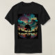 Paisaje ilustrado de siluetas arbóreas en el borde del lago con reflexión contra las nubes psicodélicas en colores vibrantes.