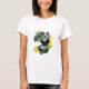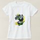 Un panda gigante está rodeado de hojas de ginkgo amarillas, una mosca, lirios de agua y hojas de loto. El panda es blanco y negro.