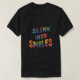 El diseño de la camiseta "Slink into Smiles" presenta un gráfico de texto vibrante y multicolor con una fuente divertida y caprichosa. La frase "Slink into Smiles" está escrita en un gran y audaz tipo de letra, con las letras curvando y fluyendo de una manera que evoca un sentido de movimiento y alegría. Los colores utilizados en el diseño son luminosos y alegres, lo que aumenta aún más la sensación general positiva de la camisa.