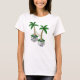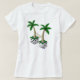 Dos dados blancos con palmeras creciendo en la parte superior, unidos por una hamaca. Los árboles también están rodeados de hierba y estanques de agua que están cayendo por los costados de los dados.