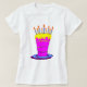 Una torta gigante de cumpleaños con helados rosados y amarillos, hielo goteando y velas azules brillantes.