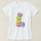 Camiseta con un diseño de acuarela de macarones dulces y deliciosos franceses apilados uno encima del otro. colores pastel bonito: violeta, verde limón, amarillo, rosa y azul.