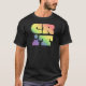 El color es muy bonito al natural, como la foto. El tejido es suave y de buena calidad. Sin defectos en el tintado, ni hilos sueltos o descosidos. Bien la impresión. Los bordes de las letras y el dibujo son nítidos, y el color contrasta muy bien con el de la camiseta.