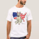 Fotografía del Pastor Alemán Blanco con la bandera de los Estados Unidos en el mapa como fondo.