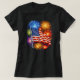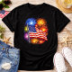 A vibrant patriotic design capturing the spirit of American celebration. A luminous American flag waves proudly at a gentle angle, its deep blue field of stars and flowing red and white stripes rendered with a painterly, glossy texture that suggests motion in the breeze. The flag is mounted on a polished silver flagpole, reflecting the surrounding light. Behind it, the night sky erupts with dazzling fireworks in brilliant blues, greens, golds, reds, and purples.