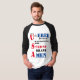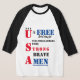 El diseño patriótico de camisetas muestra la frase "EEUU es libre porque nuestros antepasados eran hombres fuertes y valientes" delante. En el reverso se lee: "¡Y ninguno fue vacunado!" Las palabras están bien decoradas en tonos rojos, blancos y azules. En la parte de atrás está escrito con estampado rojo.