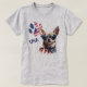 La característica de esta camisa única es una imagen acuarela de un perro chihuahua envuelto en una bandera estadounidense y usando gafas de sol azules. Al lado de la imagen del perro hay una huella de una pata de estrellas y rayas con "USA" en azul marino debajo.
