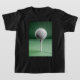Una pelota blanca de golf sobre un tejo blanco frente a un fondo verde.