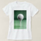 Una pelota blanca de golf sobre un tejo blanco frente a un fondo verde.