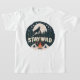 Un lobo de silueta grita contra una luna llena, rodeado por un bosque y una fogata entre dos tiendas. Las palabras "Stay Wild" se exhiben de manera destacada, enfatizando un sentido de aventura y naturaleza.