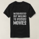 Fondo azul oscuro con texto en negrita y blanco, "Pero dispuesto a discutir películas". Perfecto para los aficionados al cine o para los aficionados casuales que buscan iniciar una conversación.