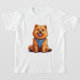 Ilustración estilo caricatura de un perro esponjoso y alegre. El perro tiene un pelaje naranja brillante con una melena tupida y una expresión amigable, mostrando una amplia sonrisa feliz. Sus ojos son grandes y expresivos, lo que contribuye a su comportamiento juguetón. El perro está sentado cómodamente, con las patas hacia adelante, y lleva una bandana azul adornada con patrones de flores blancas alrededor del cuello. El ambiente general de la ilustración es lindo e invitante, lo que la convierte en una representación conmovedora de un perro. El fondo es blanco liso, lo que enfatiza los colores vibrantes del perro.