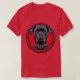 Ilustración vívida de un perro negro que lleva un collar de cadena, situada dentro de un diseño circular atrevido con un fondo azul vibrante y detalles intrincados, destacando una representación canina estilizada y artística.