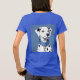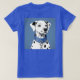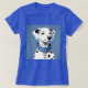 Un perro dálmata ilustrado digitalmente con manchas negras, vestido con un elegante collar azul, exhibido con un fondo azul a juego. Representación elegante y artística de una popular raza de perros.