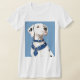 Ilustracion estilizado de un perro dálmata con un collar azul en un fondo azul claro, resaltando su peculiar apariencia manchada y su trato cordial.