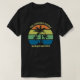 Estas modernas camisetas personalizadas de playa tropical con puesta de sol cuentan con 3 palmeras en forma de silueta frente a un cielo naranja y azul acentuado con amarillo y verde en la costa. Personalizar para un gran viaje en familia, manténgase atento para su escapada costera de vacaciones en primavera o verano o en cruceros oceánicos.