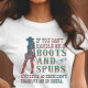 Presentamos nuestra divertida camiseta "Boots and Spurs" que puede ser personalizada con un mensaje en la parte de atrás. La parte frontal tiene una graciosa vaquera que dice con un esquema de color verde azulado y marrón, mientras que la parte posterior puede ser personalizada con un sentimiento o cita que tiene un significado especial para el usuario.