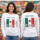 Personalized women's long sleeve t-shirt featuring the Mexican Flag, in green, white, and red, with the word MEXICO below in a design that follows the flag. You can add a name in the space provided for a special touch, in green letters. Design shows on front and back of tee. Great for celebrating family reunions, gift for travelers, and heritage gifts. Wonderful for celebrating Cinco de Mayo. Share your culture, heritage and ancestry.