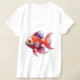 Un pequeño pez tropical vibrante presenta sorprendentes tonos rosa, violeta y naranja, adornados con intrincados motivos a rayas. Sus contornos detallados y suaves destacan sobre un fondo blanco y claro.