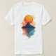 Una majestuosa montaña se eleva bajo un sol brillante, reflejada perfectamente en aguas quietas, mezclando la belleza de la naturaleza con la abstracción artística.