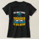 Camiseta temática de hockey para la madre del hockey con calcetines de hockey y palos con texto de blanco, amarillo y azul que dice ¡Lo único más difícil que un jugador de hockey es su mamá!