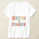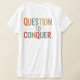 El diseño de la camiseta incluye la frase "Pregunta a conquistar" en letras en negrita y multicolor. Los colores son vivos y llamativos, creando un ambiente dinámico y enérgico. El texto está organizado de tal manera que sugiere un desafío o un rompecabezas a resolver, lo que lo convierte en una elección perfecta para quienes disfrutan de actividades intelectuales o superan obstáculos. El diseño es limpio y minimalista, lo que permite que el texto en negrita sea el principal punto focal.
