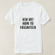 Pregúntame cómo hacer una camiseta blanca y negra voluntaria. Minimalista y elegante diseño. Texto negro personalizado sobre camiseta de color blanco editable. Unisex. Disponible en muchos colores y opciones de estilo. Ideal para voluntarios, centros comunitarios, organización, ong, caridad, campaña, etc
