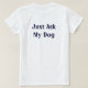 La parte de atrás de estos camisetas y tazas dice "Pregúntale a mi perro" ¿Y qué deberías preguntarle a tu perro? La parte delantera de la camisa está configurada para aceptar texto o una imagen de su elección. El texto podría decir "Digby es grande" (Digby es el perro, por supuesto). O la agilidad es divertida.