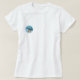 A heartwarming vector illustration featuring a tiny brown and white puppy seeking shelter under a large teal-blue umbrella. The character wears a simple red collar and clutches the curved handle, set against a circular backdrop of soft blue rain streaks. The artwork captures a cozy rainy day aesthetic with clean lines and a charming, innocent expression.