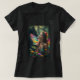 Iridescent colors explode across premium dark t-shirt fabric.