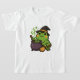 Rana dulce de halloween con gorra de bruja, escoba y caldero.