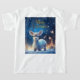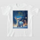 Reno bebé en un paisaje estrellado y nevado con un saludo de Feliz Navidad