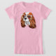 Características del este diseño un retrato de los vidrios que llevan arrogantes de un perro de aguas de rey Charles y una pajarita en un fondo rosado.