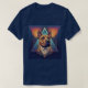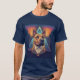 Retrato de perro adornado con elementos de diseño detallados en una paleta de colores cálidos y vibrantes. Con patrones simétricos y una pieza central triangular abstracta.