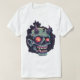 A high-contrast, stylized illustration of a horned, skull-like creature. The design features a cool-toned teal and purple color palette punctuated by glowing red eyes. Swirling dark smoke surrounds the head, which is detailed with cracked horns and sharp teeth. The artwork uses bold line work and vibrant highlights, reminiscent of modern sticker art, vintage comic books, or urban streetwear graphics.