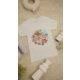 El color es muy bonito al natural, como la foto. El tejido es suave y de buena calidad. Sin defectos en el tintado, ni hilos sueltos o descosidos. Bien la impresión. Los bordes de las letras y el dibujo son nítidos, y el color contrasta muy bien con el de la camiseta.