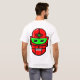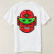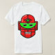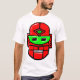Cabeza de robot roja con un elegante panel de forma de media luna verde, un tercer ojo verde, con dientes blancos y resaltados. Tiene una especie de sonrisa extraña como si hubiera descubierto las maravillas de un nuevo aceite de motor revolucionario. De un dibujo vectorial original de N.A. Berry. El motivo se repite en la parte trasera y en la parte delantera.