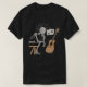 Un robot con pelo puntiagudo y una expresión confusa se sienta en un taburete, reflexionando sobre dónde se conecta el plugin en una guitarra acústica. La burbuja de pensamiento sobre su cabeza contiene un tapón de guitarra y signos de interrogación, lo que indica contemplación y confusión.