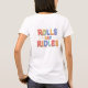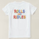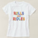 Esta vibrante camiseta muestra la frase "Rolls and Riddle" en un diseño juguetón y multicolor. La palabra "Rolls" se representa en un tipo de letra negrita y redondeado con un gradiente de tonos cálidos, pasando de rojo a amarillo