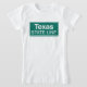 Rótulo de Texas State Line Road escrito en blanco sobre un fondo verde. Este diseño parece realmente efectivo en esta camiseta de Chicas