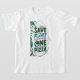 El diseño de la camiseta tiene un mensaje humorístico y juguetón: "Salven el planeta, es el único con pizza". La frase está escrita en un audaz y llamativo tipo de letra, combinando conciencia ambiental con un toque de humor. Para mejorar visualmente el diseño, se podría incorporar un elemento gráfico que represente una porción de pizza o un planeta con una caja de entrega de pizza, añadiendo un tono alegre y relacionado. La estética general es divertida e informal, atrayendo a los que aprecian un poco de ingenio y humor y a la vez promocionando la conciencia ambiental.