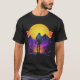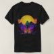 Un diseño de paisaje montañoso fresco de estilo retro con un toque colorido, donde se puede practicar senderismo al atardecer.