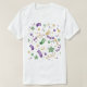 This lively illustration showcases a rich assortment of shiny confetti elements scattered across a dark background. The design features glossy stars, curved ribbons, beads, dots, and abstract shapes in vibrant purple, green, and gold tones, creating a bold and energetic festive atmosphere.