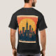 Este diseño presenta una silueta estilizada de un horizonte urbano contra un gran sol de color amarillo naranja. Los edificios se representan en una marina oscura o en negro, con ventanas iluminadas en tonos naranjas y amarillos que imitan el color del sol. El cielo es un gradiente de naranja y rojo, y algunas nubes simples y horizontales pasan a través de él. El estilo general recuerda a un poster de viaje vintage o a un ilustracion retro, con un efecto texturizado angustioso que le da un ambiente de postal envejecido. La composición es sencilla pero llamativa, evocando nostalgia y tranquilidad urbana.