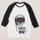 Imagen grande de un cráneo humano detrás de la máscara de la mascarada. Ojos rojos. Un texto Adivina quién? debajo de la imagen. Fondo blanco o claro. Camiseta macho de personalizable. Puede cambiar la imagen y puede cambiar o eliminar el texto de la plantilla. No dude en usar el Personalizar de botones para ajustar el producto a sus necesidades. Por ejemplo, puede cambiar el tipo de letra y el color del tipo de letra. No te olvides de elegir otro estilo, color, tamaño y género de la ropa, ya que hay más de 150 diseños disponibles. Bien por una fiesta de Halloween. Aándenlos a todos.